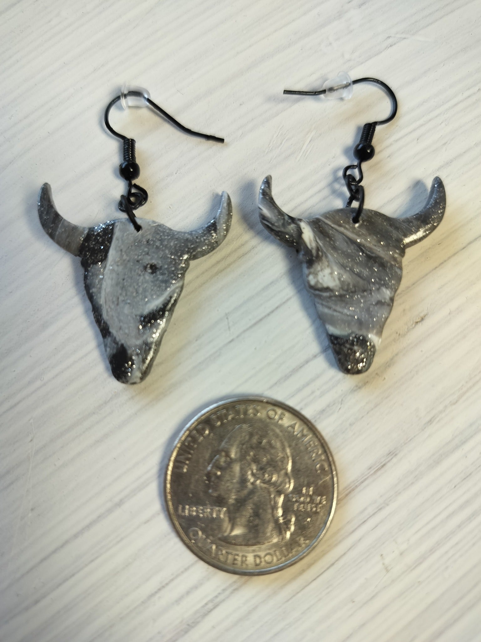 Black, gray, silver, & white marbled bulls with some sparkle. Quarter is to show size.