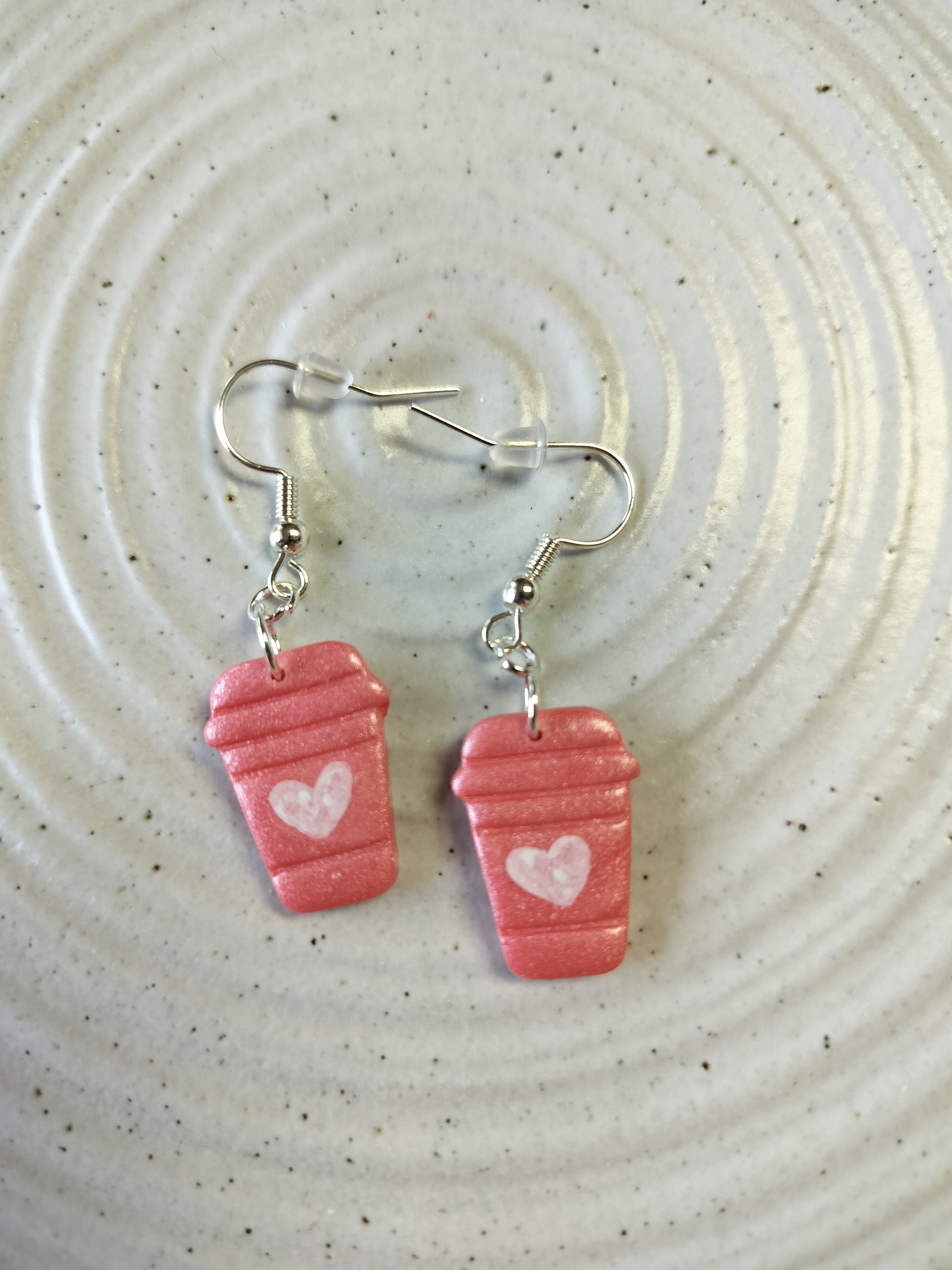 Coral coffee mugs with a white heart detail.